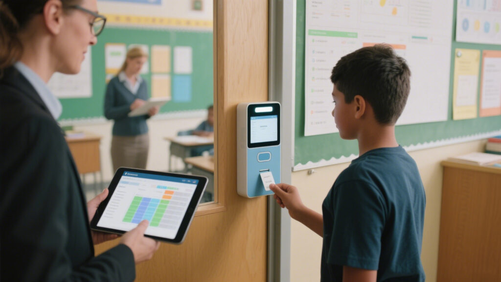 Students only need to carry an RFID-enabled ID card. A quick swipe records attendance — whether at the school gate in the morning or the classroom door. Teachers no longer need to call the roll manually, saving at least one-third of their time.